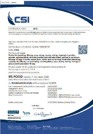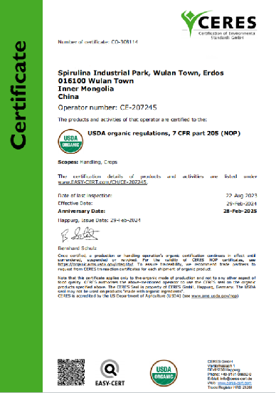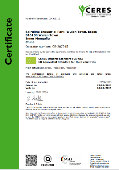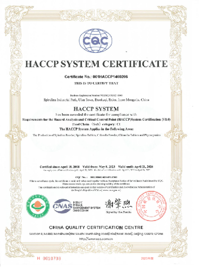 With 15 years experience, we engaged in spirulina breeding, processing, R&D and marketing. Till now have obtained BRC, HACCP, HALAL, KOSHER, ORGANIC (EU/NOP) certifications with an annual capacity of 1500tons.